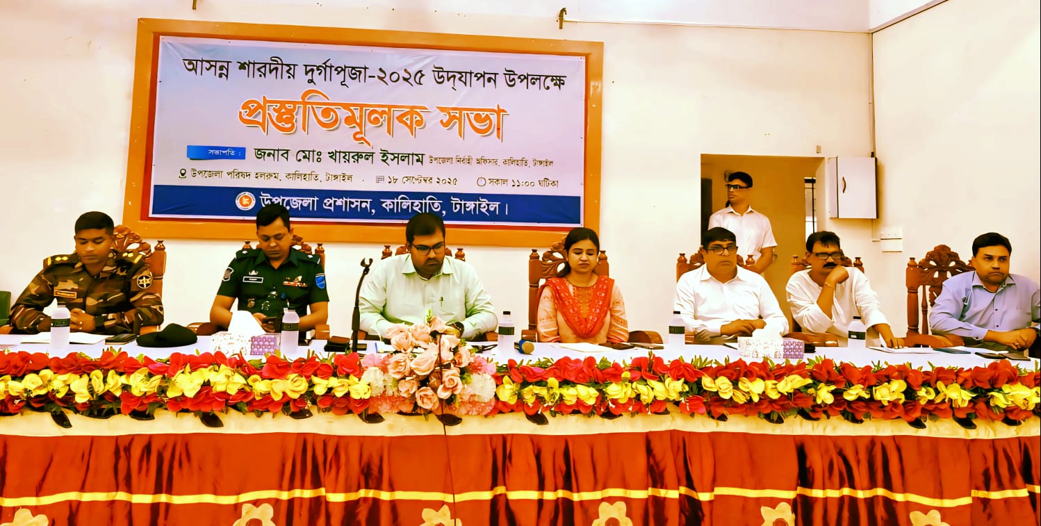 টাঙ্গাইলের কালিহাতীতে আসন্ন শারদীয় দুর্গাপূজা সুষ্ঠুভাবে উদযাপনের লক্ষ্যে প্রস্তুতিমূলক সভা অনুষ্ঠিত হয়েছে।গত বৃহস্পতিবার (১৮ সেপ্টেম্বর) উপজেলা পরিষদ হলরুমে এই সভার আয়োজন করা হয়।