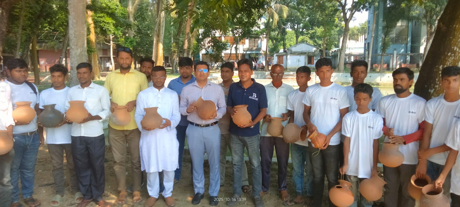 উপস্থিত সকলের হাতে মাটির তৈরি কলস দেখা যায়, যা পাখির বাসা হিসেবে গাছে স্থাপন করা হবে।