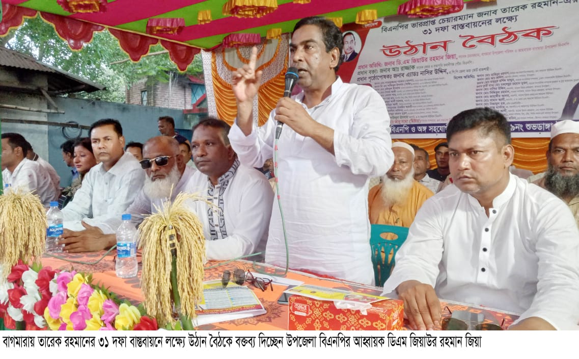 বিএনপির ভারপ্রাপ্ত চেয়ারম্যান তারেক রহমানের প্রদত্ত রাষ্ট্র কাঠামো মেরামতের ৩১ দফা বাস্তবায়নের লক্ষ্যে বাগমারায় বিএনপির উদ্যোগে উঠান বৈঠক অনুষ্ঠিত হয়েছে। এ উপলক্ষ্যে শনিবার সন্ধ্যায় শুভডাঙ্গা ইউনিয়নের বাইগাছা হাইস্কুল মাঠে আলোচনা সভা অনুষ্ঠিত হয়। এতে প্রধান অতিথি হিসাবে বক্তব্য দেন আগামী জাতীয় সংসদ নির্বাচনে রাজশাহী-৪, বাগমারা আসনে বিএনপির মনোনয়ন প্রত্যাশী উপজেলা বিএনপির আহবায়ক ও সাবেক উপজেলা চেয়ারম্যান প্রধান শিক্ষক ডি.এম জিয়াউর রহমান জিয়া। শুভডাঙ্গা ইউনিয়ন বিএনপির সভাপতি অধ্যাপক শফিকুল ইসলামের সভাপতিত্বে ও সাধারণ সম্পাদক আবু সামা মিষ্টারের সঞ্চালনায় সভায় অন্যদের মধ্যে বক্তব্য দেন- রাজশাহী জর্জ কোর্টের এপিপি অ্যাডভোকেট নাসির উদ্দীন, নরদাশ ইউপির প্যানেল চেয়ারম্যান রফিকুল ইসলাম, বাগমারা উপজেলা বিএনপির সাবেক সদস্য সচিব অধ্যাপক সামসুজ্জোহা বাদশা, ভবানীগঞ্জ পৌর বিএনপির সাবেক সাংগঠনিক সম্পাদক জয়নাল আবেদীন, বাগমারা উপজেলা তাঁতী দলের আহবায়ক মামুনুর রশিদ মামুন, গোবিন্দপাড়া ইউনিয়ন বিএনপির সভাপতি মাষ্টার সৈয়দ আলী, সাধারণ সম্পাদক শাহনাজ পারভিন, গোয়ালকান্দি ইউনিয়ন বিএনপির সাবেক সাংগঠনিক সম্পাদক মামুনুর রশিদ মামুন, হামিরকুৎসা ইউনিয়ন বিএনপির সভাপতি বেলাল শাহ, তারেক জিয়া প্রজন্ম দলের উপজেলা সম্পাদক সিদ্দিকুর রহমান, তারেক জিয়া প্রজন্ম দলের শুভডাঙ্গা ইউনিয়ন সভাপতি জাহাঙ্গীর আলম, মাড়িয়া ইউনিয়ন বিএনপির সভাপতি হুজুর আলী, আউচপাড়া ইউনিয়ন বিএনপির ভারপ্রাপ্ত সভাপতি শামসুদ্দিন কারিগর, হিন্দু, বৌদ্ধ, খ্রিষ্টান কল্যাণ ফ্রন্টের উপজেলা কমিটির সভাপতি বিধারন চন্দ্র প্রামানিক, সাধারণ সম্পাদক সুব্রত মন্ডল বিদ্যুত, পূজা উদযাপন ফ্রন্টের উপজেলা কমিটির সভাপতি শন্তুনাথ প্রামানিক, সাধারণ সম্পাদক নীরেন্দ্রনাথ প্রামানিক, অধ্যাপক মনোরঞ্জন সরকার ও উপজেলা ছাত্রদলের সাবেক সাংগঠনিক সম্পাদক মোকলেছুর রহমান মুকুল প্রমূখ।