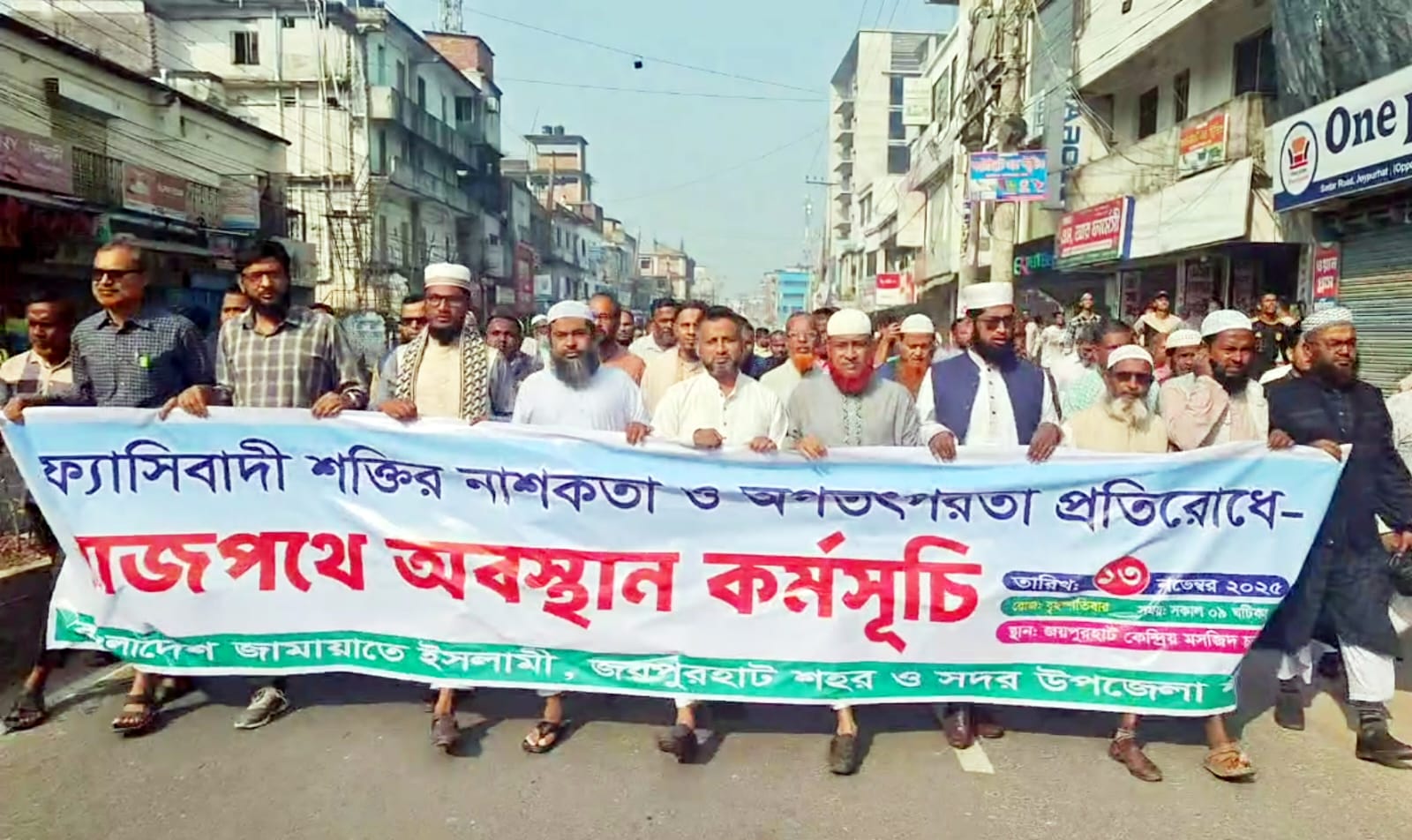 ফ্যাসিবাদী শক্তির নাশকতা ও অপতৎপরতা প্রতিরোধে জয়পুরহাটে বিক্ষোভ মিছিল ও অবস্থান কর্মসূচী পালন করেছে জেলা জামায়াত।
