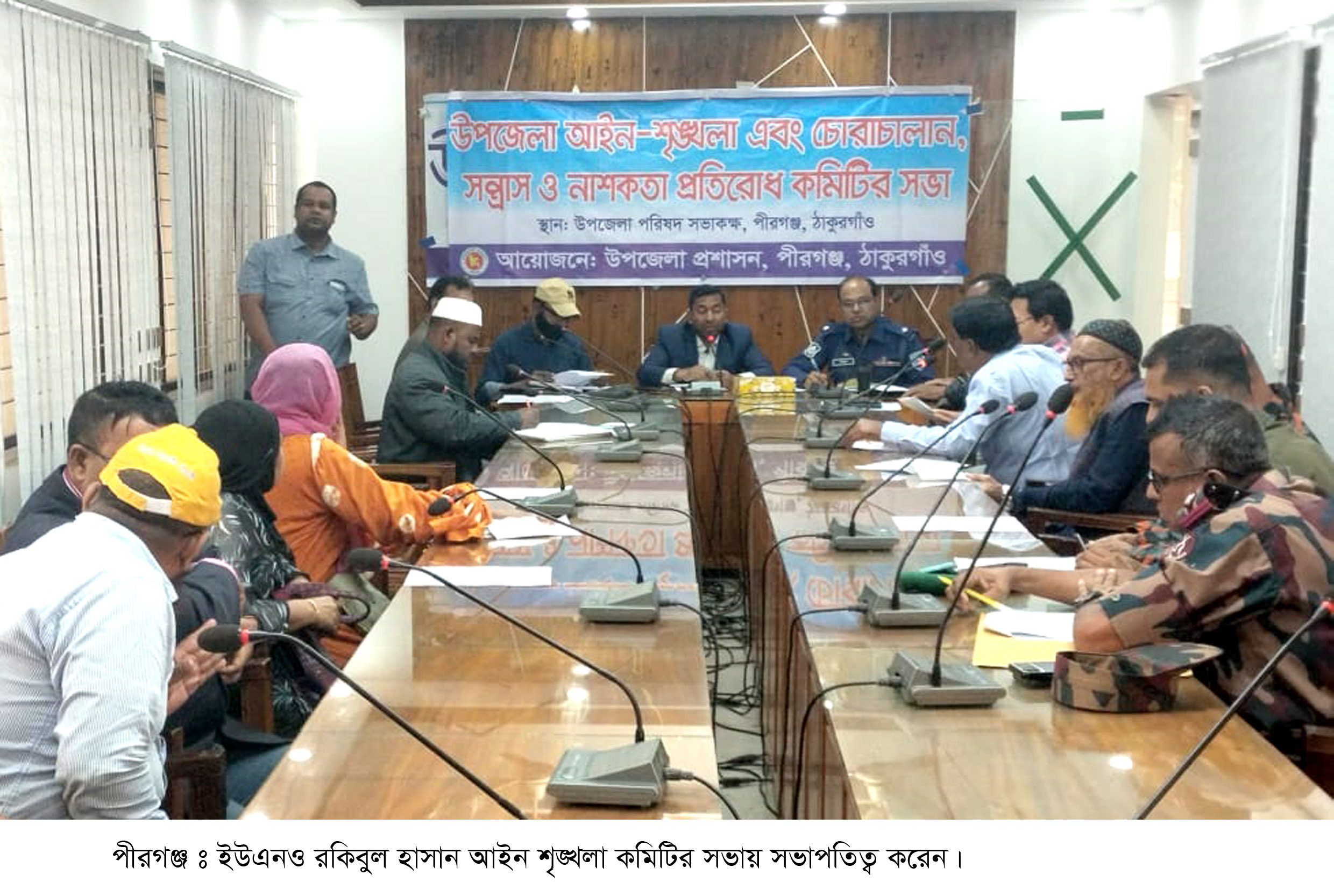 বৃহস্পতিবার সকাল সাড়ে ১০টায় পীরগঞ্জ উপজেলা পরিষদ সভা কক্ষে আইন শৃঙ্খলা কমিটির মাসিক সভা অনুষ্ঠিত হয়। পাশাপাশি সন্ত্রাস ও নাসকতা প্রতিরোধ, চোরা চালান প্রতিরোধ ও উপজেলা পরিষদের মাসিক সমন্বয় সভা অনুষ্ঠিত হয়। ২/১টি বিচ্ছিন্ন ঘটনা ছাড়া পীরগঞ্জ উপজেলার আইন শৃঙ্খলার সার্বিক পরিস্থিতি যথেষ্ট ভাল রয়েছে বলে কমিটির সংশ্লিষ্টরা জানায়। এছাড়া বর্তমান প্রেক্ষাপট অনুযায়ী আইন শৃঙ্খলার পরিস্থিতি স্বাভাবিক রাখতে ও জনগণের জানমালের নিরাপত্তা নিশ্চিত করতে উপজেলা প্রশাসন, পুলিশ প্রশাসন সহ সব শ্রেণির প্রশাসন তৎপর রয়েছে। ওই সময় দিক নির্দেশনা ও পরামর্শ মূলক বক্তব্য দেন কমিটির সভাপতি উপজেলা নির্বাহী অফিসার ও নির্বাহী ম্যাজিষ্ট্রেট রকিবুল হাসান, থানা অফিসার ইনচার্জ (ওসি) তাজুল ইসলাম, স্বাস্থ্য কমপ্লেক্স ভারপ্রাপ্ত কর্মকর্তা ডাঃ কামাল আহম্মেদ, ইউপি চেয়ারম্যান সাইদুর রহমান, মোস্তফা আলম, মোখলেসুর রহমান চৌধুরী, পীরগঞ্জ প্রেসক্লাব সভাপতি জয়নাল আবেদীন বাবুল, উপজেলা প্রেসক্লাব সভাপতি ও দৈনিক জনকন্ঠ পত্রিকার পীরগঞ্জ প্রতিনিধি মোশাররফ হোসেন, সাধারণ সম্পাদক আব্দুল আলিম, দূর্নীতি প্রতিরোধ কমিটির সাধারণ সম্পাদক সাংবাদিক মোকাদ্দেস হায়াত মিলন সহ সংশ্লিষ্টরা।