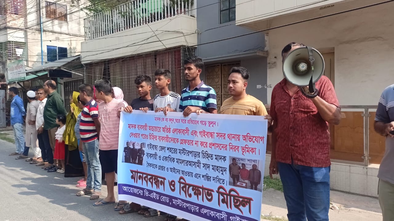মাদক কে না বলুন, ঘরে ঘরে প্রতিরোধ গড়ে তুলুন এই প্রতিপাদ্যকে সামনে রেখে মাদক ব্যবসায়ী অত্যাচারে অতিষ্ঠ গাইবান্ধা শহরের মাস্টারপাড়া সাধারণ জনগণ ও এলাকাবাসী। গাইবান্ধা সদর থানায় অভিযোগ দেওয়ার পরেও চিহ্নিত ব্যবসায়ীদেরকে গ্রেফতার না করে প্রশাসনের নিরব ভূমিকা পালন করছে।এর কারণে মাস্টারপাড়ার এলাকাবাসী আজ সকাল ১১ টায় ভি-এইড মসজিদের সামনে গাইবান্ধা শহরের মাস্টার পাড়ার চিহ্নিত মাদক ব্যবসায়ী ও একাধিক মামলার আসামী সাদ মাহামুদ সৈকতকে গ্রেপ্তার ও আইনের আওতায় এনে শাস্তির দাবিতে মানববন্ধন ও বিক্ষোভ মিছিল অনুষ্ঠিত হয়েছে। উক্ত মানববন্ধন ও বিক্ষোভ মিছিলে বক্তব্য রাখেন সচেতন এলাকাবাসী ও যুব সমাজ।