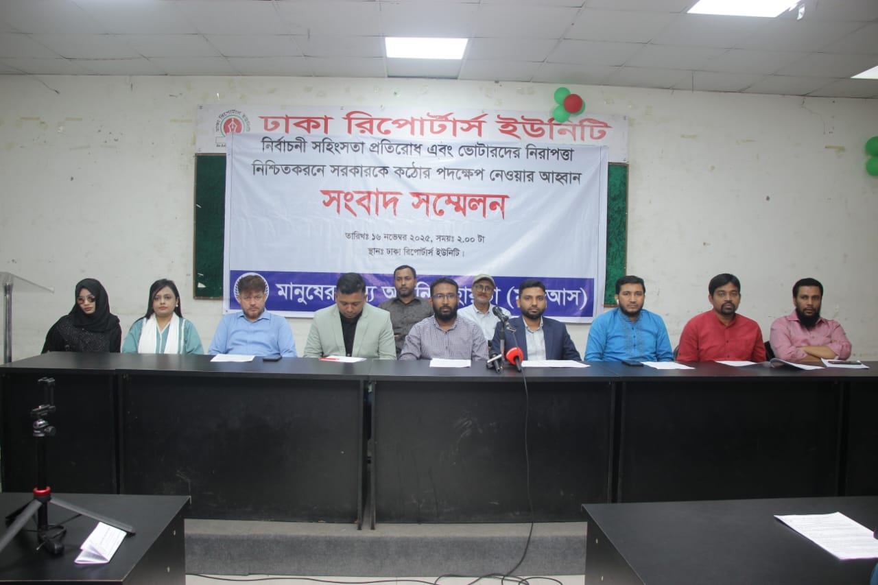 রোববার (১৬নভেম্বর) বিকেলে ঢাকা রিপোর্টার্স ইউনিটেতে ‘নির্বাচনী সহিংসতা রোধে ও ভোটারদের নিরাপত্তা নিশ্চিতে সরকারকে কঠোর পদক্ষেপ নেওয়ার আহ্বান’- শীর্ষক সংবাদ সম্মেলনে এই দাবি পেশ করা হয়েছে।