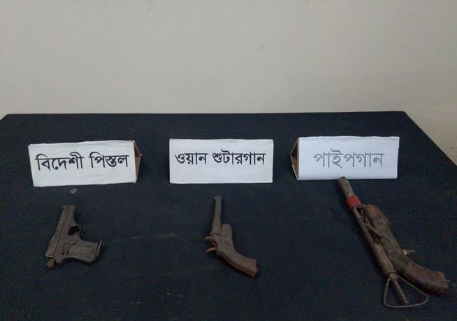 শনিবার রাত সাড়ে ১২টার দিকে বাঘা থানাধীন খায়েরহাট এলাকায় অভিযান চালিয়ে ১টি বিদেশি পিস্তল, ১টি পাইপগান, ১টি ওয়ান শুটারগান ও ১টি ম্যাগজিন উদ্ধার করা হয়।