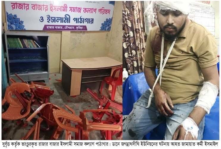 এ সময় উপজেলা ছাত্রদলের সহ-সভাপতি সাইফুল ইসলাম রাশেদের নেতৃত্বে কয়েকজন উৎশৃঙ্খলভাবে স্লোগান দিয়ে জামায়াত সমর্থকদের উপর চড়াও হয়। এর প্রতিবাদে জামায়াত সমর্থকরা তাদের উপর হামলা করলে বিএনপি সমর্থিত রফিক মেম্বার, তপনসহ কয়েকজন আহত হয়। এছাড়াও বিক্ষুব্ধরা বিএনপির সমর্থক আরব হোসেন রাজুর বাড়িতে হামলা করে। পরে চৌদ্দগ্রাম উপজেলা ছাত্রদলের সাধারণ সম্পাদক, সাবেক চেয়ারম্যান আব্দুল্লাহ চৌধুরী পাশার ছেলে আবির চৌধুরীর নেতৃত্বে ছাত্রদলের নেতাকর্মীরা জামায়াত কর্মী ইসমাইল হোসেনকে কুপিয়ে মারাত্মক জখম করে। এ ঘটনায় আহতদের অধিকাংশই বিভিন্ন হাসপাতালে প্রাথমিক চিকিৎসা গ্রহণ করেছে। তবে, জামায়াত কর্মী ইসমাইলের অবস্থা আশঙ্কাজনক হওয়ায় তাকে উন্নত চিকিৎসার জন্য কুমিল্লার একটি বেসরকারি হাসাপাতালে প্রেরণ করা হয়েছে। জগন্নাথদীঘি ইউনিয়নে হামলার প্রতিবাদে উজিরপুর ইউনিয়ন স্বেচ্ছাসেবক দল নেতা খালেদ সাইফুল্লাহ এর নেতৃত্বে একটি গ্রুপ কালিকাপুর ইউনিয়নের রাজার বাজার ইসলামী সমাজ কল্যাণ পরিষদ ও পাঠাগার কার্যালয় ভাংচুর করেছে বলে অভিযোগ করেছে জামায়াতে ইসলামী। সংবাদ পেয়ে দুটি ঘটনাস্থল পরিদর্শন করেছে চৌদ্দগ্রাম থানা পুলিশের পৃথক টিম ঘটনাস্থল পরিদর্শন করেছে।