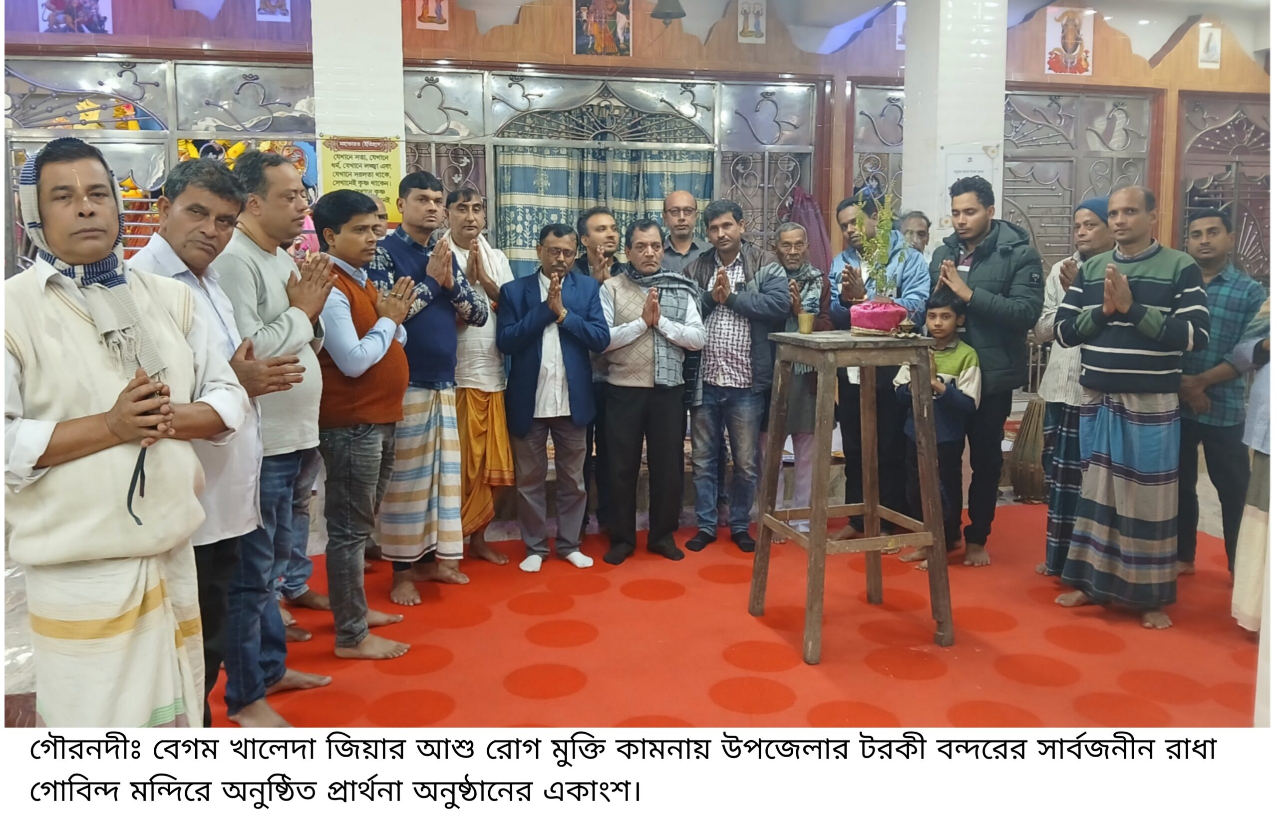 বিএনপি চেয়ারপার্সন, সাবেক প্রধানমন্ত্রী, দেশনেত্রী বেগম খালেদা জিয়ার আশু রোগ মুক্তি কামনায় সোমবার রাতে বরিশালের গৌরনদীর একটি মন্দিরে সনাতন ধর্মাবলম্বীদের প্রার্থনা অনুষ্ঠান অনুষ্ঠিত হয়েছে। ধর্মীয় ভাব গাম্ভীর্যের মধ্য দিয়ে সোমবার রাত ৮টায় উপজেলার টরকী বন্দরের সার্বজনীন রাধা গোবিন্দ মন্দিরে সনাতন ধর্মাবলম্বীদের ওই প্রার্থনা অনুষ্ঠানটি অনুষ্ঠিত হয়। মন্দিরের পুরোহিত শ্রী উত্তম চক্রবর্তী প্রার্থনা অনুষ্ঠানটি পরিচালনা করেন। এর আগে তারা বেগম খালেদা জিয়ার রোগমুক্তি কামনায় ধর্মীয় নানা আচার অনুষ্ঠান পালন করেন। গৌরনদী উপজেলা পূজা উদযাপন কমিটির সভাপতি অধ্যক্ষ নির্মল চন্দ্র হালদারের সভাপতিত্বে অনুষ্ঠিত প্রার্থনা অনুষ্ঠানে অন্যান্যের মধ্যে বক্তব্য রাখেন উপজেলা পূজা উদযাপন কমিটির সহ-সাধারণ সম্পাদক বিশ্বজিৎ রায়, সহ-সাধারণ সম্পাদক বিকাশ চক্রবর্তী, কোষাধ্যক্ষ শ্রীকৃষ্ণ চক্রবর্তী, সদস্য বিপুল ঘোষ, টরকী বন্দর ভিক্টোরী মাধ্যমিক বিদ্যালয়ের সিনিয়র শিক্ষক গুরুদাস গোস্বামী প্রমূখ।