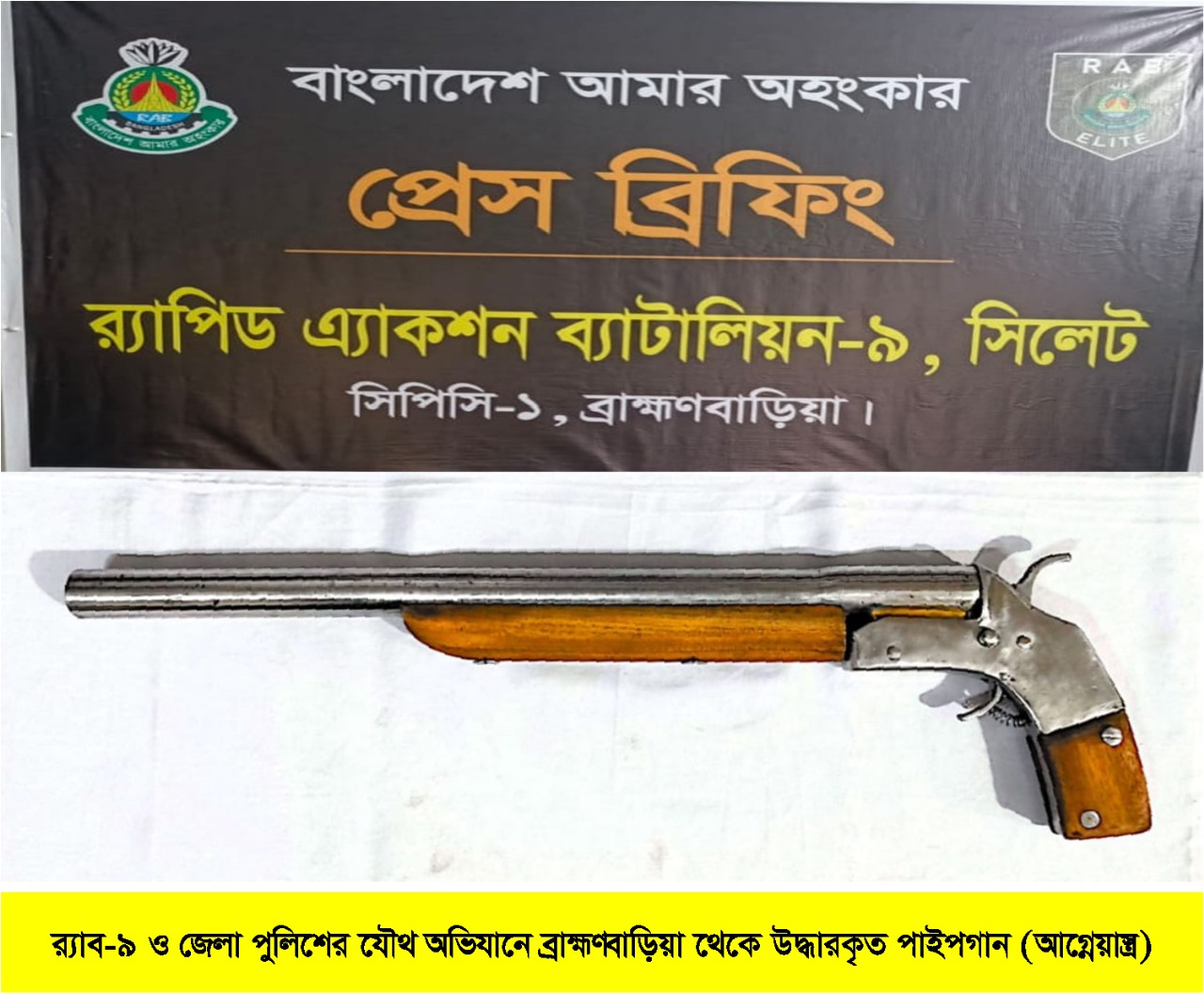 ব্রাহ্মণবাড়িয়া জেলা পুলিশ এবং র্যাব-৯ এর যৌথ অভিযানে সদর উপজেলার ভাদুঘর শান্তিনগর এলাকা থেকে পরিত্যক্ত অবস্থায় একটি বিদেশী পাইপগান উদ্ধার করা হয়েছে।