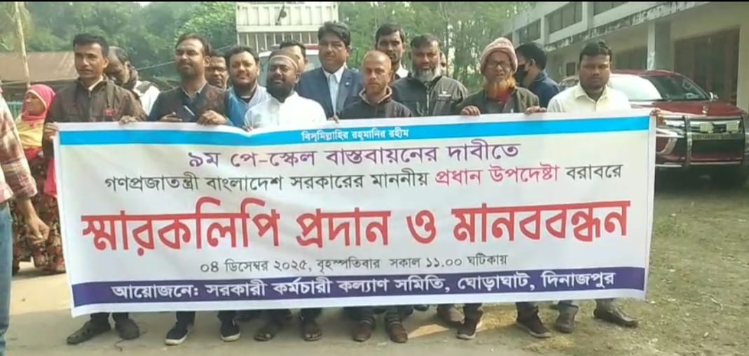দিনাজপুরের ঘোড়াঘাটে সকল কর্মচারীদের সমন্বয়ে ৯ম পে-স্কেল বাস্তবায়নের দাবিতে বিক্ষোভ মিছিল, মানববন্ধন ও মাননীয় প্রধান উপদেষ্টা বরাবরে স্মারকলিপি প্রদান করেছে সরকারি কর্মচারী কল্যাণ সমিতি।