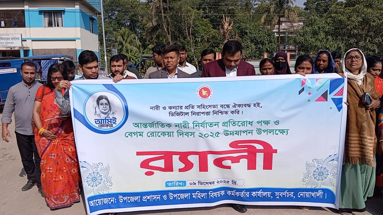 গতিশীল জীবনযাত্রায় নারী এখন পুরুষের চেয়ে কোনো অংশে কম নয়। শিক্ষাক্ষেত্র থেকে কর্মক্ষেত্রে পুরুষের সঙ্গে তাল মিলিয়ে এগিয়ে চলছেন নারীরা। এমনটাই চেয়েছিলেন বেগম রোকেয়া। তবে সমাজবিজ্ঞানী ও নারী নেত্রীদের ভাষ্য, শিক্ষাসহ বিভিন্ন ক্ষেত্রে নারীরা নিজ নিজ যোগ্যতায় এগিয়ে গেলেও নারী সুরক্ষায় পিছিয়ে আছে। ঘরে-বাইরে নারীদের নিরাপত্তা নেই। নারীদের ওপর নেমে আসছে নানা ধরনের নির্যাতন ও সহিংসতা। ‘আমিই রোকেয়া’ শিরোনামে এবং নারী ও কন্যার প্রতি সহিংসতা বন্ধে ঐক্যবদ্ধ হই, ডিজিটাল নিরাপত্তা নিশ্চিত করি। এই প্রতিপাদ্য কে সামনে রেখে প্রতি বছরের ন্যায় এবারও সরকারিভাবে দিবসটি পালিত হচ্ছে। মহিলা ও শিশুবিষয়ক মন্ত্রণালয় ও সুবর্ণচর উপজেলা প্রশাসনের আয়োজনে মঙ্গলবার ( ৯ ডিসেম্বর) সকাল ১০ টায় আন্তর্জাতিক নারী নির্যাতন প্রতিরোধ পক্ষ ও বেগম রোকেয়া দিবস ২০২৫ উদযাপন উপলক্ষে র্যালি ও আলোচনা সভা অনুষ্ঠিত হয়।