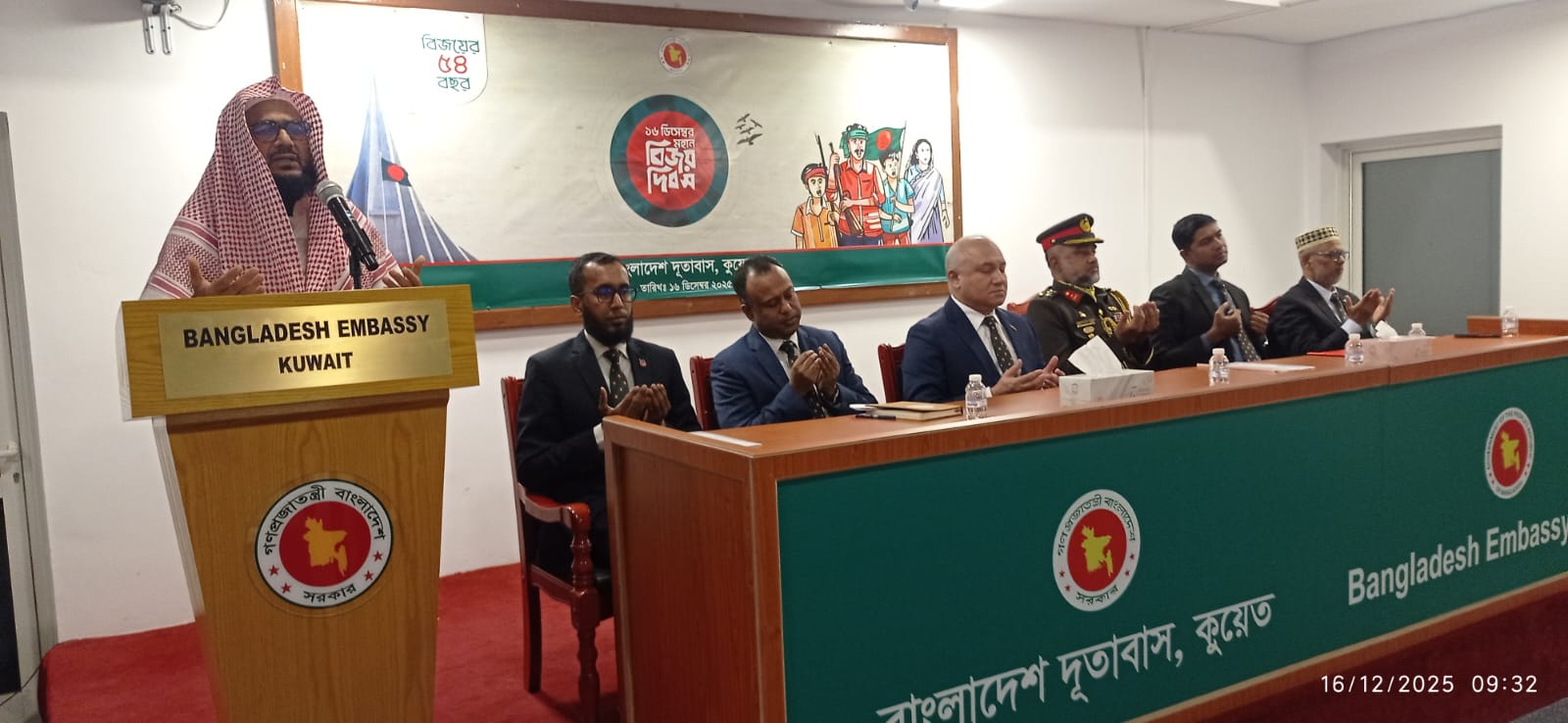 বাংলাদেশ দূতাবাস কুয়েতে যথাযথ মর্যাদা ও উৎসাহ উদ্দীপনার মধ্য দিয়ে গতকাল মহান বিজয় দিবস উদযাপিত হয়েছে। অনুষ্ঠানে কুয়েত এ নিযুক্ত বাংলাদেশের মান্যবর রাষ্ট্রদূত মেজর জেনারেল সৈয়দ তারেক হোসেন সাহেব সভাপতি ছিলেন। এতে দূতাবাসের কর্মকতা, বাংলাদেশ কমিউনিটির সদস্যবৃন্দ এবং বাংলাদেশী পত্রপত্রিকা ও টিভি প্রতিনিধিগণ উপস্থিত ছিলেন।