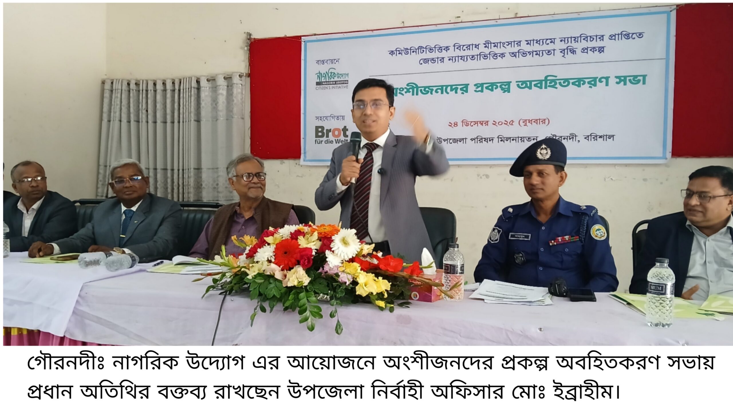 বেসরকারি উন্নয়ন সংস্থা নাগরিক উদ্যোগ এর আয়োজনে বুধবার বরিশালের গৌরনদীতে অংশীজনদের প্রকল্প অবহিতকরণ সভা অনুষ্ঠিত হয়েছে। জার্মান সংস্থা ব্রেড ফর দি ওয়ার্ল্ড এর সহযোগিতায় “কমিউনিটিভিত্তিক বিরোধ মীমাংসার মাধ্যমে ন্যায়বিচার প্রাপ্তিতে জেন্ডার ন্যায্যতা,। ভিত্তিক অভিগম্যতা বৃদ্ধি প্রকল্প” নামের ওই প্রকল্পটি নাগরিক উদ্যোগ এর মাধ্যমে বাস্তবায়নের লক্ষ্যে অবহিতকরণ সভাটির আয়োজন করা হয়েছিল। বেসরকারি সংস্থা এইড এর নির্বাহী পরিচালক ও উপজেলা এনজিও সমন্বয় কমিটির সভাপতি প্রেমানন্দ ঘরামীর সভাপতিত্বে বুধবার সকাল ১০টায় গৌরনদী উপজেলা পরিষদ অনুষ্ঠিত অবহিতকরণ সভায় প্রধান অতিথি হিসেবে উপস্থিত ছিলেন গৌরনদী উপজেলা নির্বাহী কর্মকর্তা মোঃ ইব্রাহীম। অনুষ্ঠানে বিশেষ অতিথি হিসেবে উপস্থিত ছিলেন নাগরিক উদ্যোগের নির্বাহী প্রধান মোঃ জাকির হোসেন, গৌরনদী মডেল থানার ওসি (তদন্ত) মোঃ মাহাবুবুর রহমান, গৌরনদী প্রেসক্লাবের আহবায়ক জহুরুল ইসলাম জহির, উপজেলা সমবায় অফিসার আফসানা শাখী, উপজেলা যুব উন্নয়ন কর্মকর্তা বিভাস চন্দ্র দাস, চাঁদশী ইউপির ভারপ্রাপ্ত চেয়ারম্যান প্রসেনজিৎ দেবনাথ। সভায় প্রকল্প পরিচিতি ও প্রকল্পের কার্যক্রম সম্পর্কে ব্যাখ্যা দিয়ে বক্তব্য রাখেন প্রকল্প সমন্বয়কারী মোসাম্মৎ লাকী আক্তার। অন্যের মধ্যে বক্তব্য রাখেন, নলচিড়া ইউপির সাবেক চেয়ারম্যান বীর মুক্তিযোদ্ধা সেকান্দার আলী মৃধা, বীর মুক্তিযোদ্ধা মোঃ শাহ আলম ফকির, সরিকল ইউপি চেয়ারম্যান মোঃ ফারুক হোসেন মোল্লা, নারী নেত্রী মাধবী রানী দাস, বীর মুক্তিযোদ্ধা মোঃ ইসাহাক সন্যামত প্রমূখ্য।