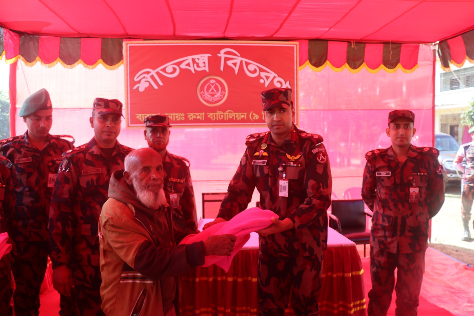 মাননীয় মহাপরিচালক, বর্ডার গার্ড বাংলাদেশ এর নির্দেশনায় রুমা ব্যাটালিয়ন (৯ বিজিবি) এর ব্যবস্থাপনায় অদ্য ০৬ জানুয়ারি ২০২৬ তারিখ ১১৩০ ঘটিকা হতে ১২৩০ ঘটিকা পর্যন্ত স্থানীয় ‘রুমা সাঙ্গু সরকারী কলেজ’প্রাঙ্গণে বান্দরবান জেলাধীন রুমা উপজেলার চান্দাপাড়া, পাইন্দুপাড়া, সায়াগ্রাপাড়া, সাইপ্রোপাড়া, জাবালুল কুরআন মাদ্রাসা ও এতিমখানা এবং সদরঘাট এলাকার শীতার্তদের মাঝে শীতবস্ত্র হিসেবে ২৫০টি কম্বল বিতরণ করা হয়। উক্ত অনুষ্ঠানে প্রধান অতিথি হিসেবে উপস্থিত ছিলেন লেঃ কর্নেল মোহাম্মদ হাসান শাহরিয়ার, পদাতিক, অধিনায়ক, রুমা ব্যাটালিয়ন (৯ বিজিবি), ভারপ্রাপ্ত উপ-অধিনায়ক মেজর তিমির রঞ্জন মহান্ত, এএমসি এবং ভারপ্রাপ্ত কোয়ার্টার মাষ্টার সহকারী পরিচালক মোঃ জসিম উদ্দিন। এছাড়াও স্থানীয় জনপ্রতিনিধি ও গণ্যমান্য ব্যক্তিবর্গ উপস্থিত ছিলেন। ইতোপূর্বে রুমা ব্যাটালিয়ন (৯ বিজিবি) গরীব ও দুঃস্থদের মাঝে খাবার, ত্রাণসামগ্রী ও বিনামূল্যে চিকিৎসা সেবাসহ বিভিন্ন কল্যাণমূলক কর্মকান্ড পরিচালনা করেছে এবং ভবিষ্যতে এ ধরণের কল্যাণমূলক কর্মকান্ড অব্যাহত থাকবে।