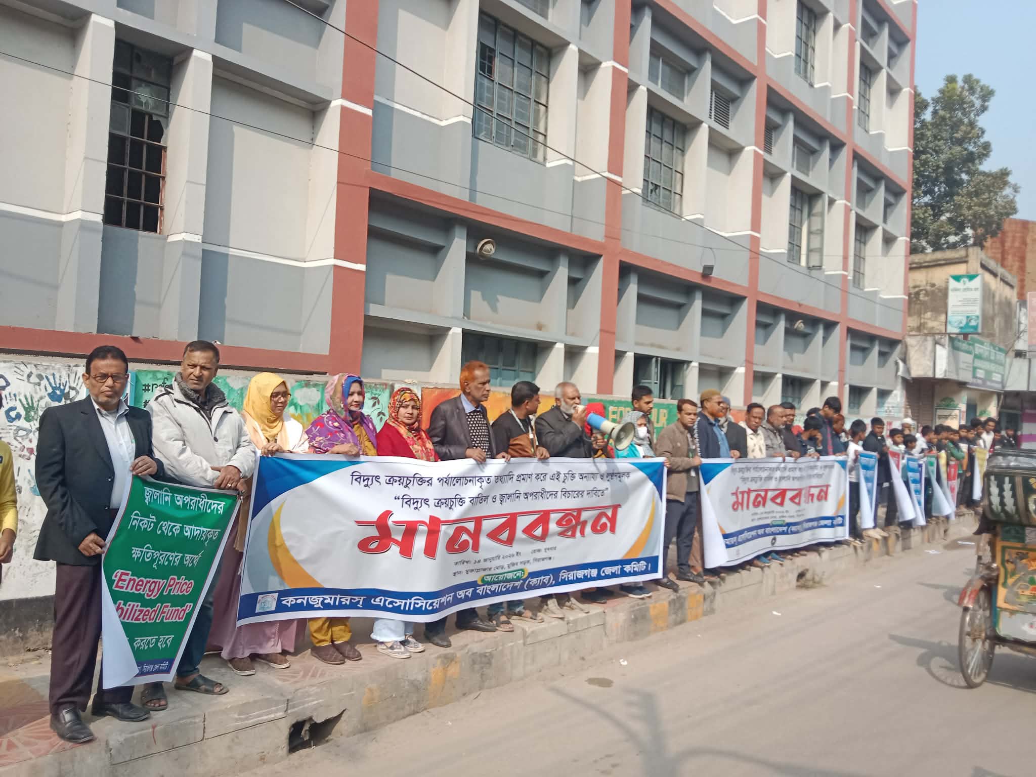 ‘‘দায়মুক্তি আইনের আওতায়-বিদ্যুৎ ও জ্বালানী খাতে সম্পাদিত সব বিনিয়োগ ও ক্রয় চুক্তি বাতিল এবং জ্বালানি অপরাধীদের বিচারের দাবিতে সিরাজগঞ্জে মানববন্ধন‘‘ অনুষ্ঠিত হয়।