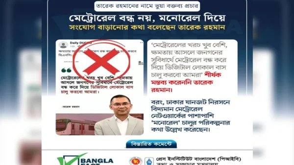 বিএনপির চেয়ারম্যান তারেক রহমানের বক্তব্য বিকৃত করে জনমনে বিভ্রান্তি ছড়ানোর একটি অপচেষ্টা শনাক্ত করেছে প্রেস ইনস্টিটিউট বাংলাদেশের (পিআইবি) ফ্যাক্ট চেক ও মিডিয়া রিসার্চ টিম ‘বাংলাফ্যাক্ট’।বাংলাফ্যাক্ট জানায়, ইন্টারনেটে একটি ভুয়া তথ্য ...বিস্তারিত পড়ুন