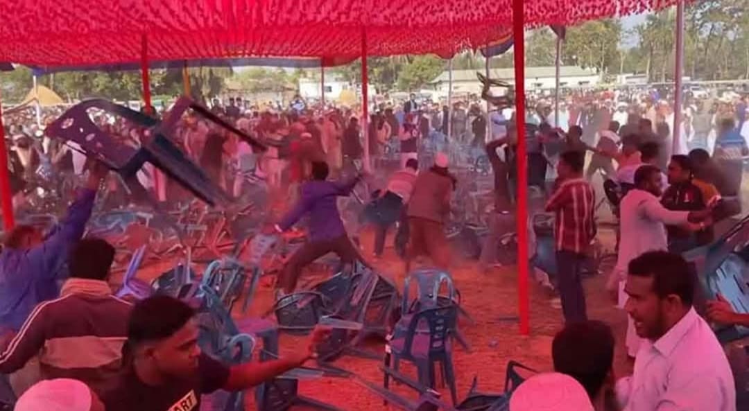 এদিকে জামায়াতে ইসলামী মনোনীত প্রার্থী নুরুজ্জামান বাদলের নেতাকর্মীরা আগে থেকেই চেয়ারে বসা থাকলেও বিএনপি’র প্রার্থী মাহমুদুল হক রুবেল অনুষ্ঠানস্থলে না পৌঁছায় বিএনপি’র আগত নেতাকর্মীরা অপেক্ষায় ছিলেন। ফলে চেয়ারে সবার বসা হয়নি। এসময় চেয়ারে বসা নিয়ে জামায়াতের নেতাকর্মীদের সঙ্গে বিএনপি’র নেতাকর্মীদের বাকবিতণ্ডা থেকে চেয়ার ছুঁড়াছুঁড়ি শুরু হয়। একপর্যায়ে রণক্ষেত্রে পরিণত হয় অনুষ্ঠানস্থল। ভেঙে ও পুড়িয়ে দেওয়া হয় বেশ কয়েকটি মোটরসাইকেল। লণ্ডভণ্ড হয়ে যায় ইশতেহার পাঠ অনুষ্ঠানস্থল। সবশেষ খবর পাওয়া পর্যন্ত সংঘর্ষে উভয়পক্ষের অন্তত ৫০ জন আহত হয়েছেন। নতুন করে আবারও সংঘর্ষের আশঙ্কা করছেন স্থানীয়রা।