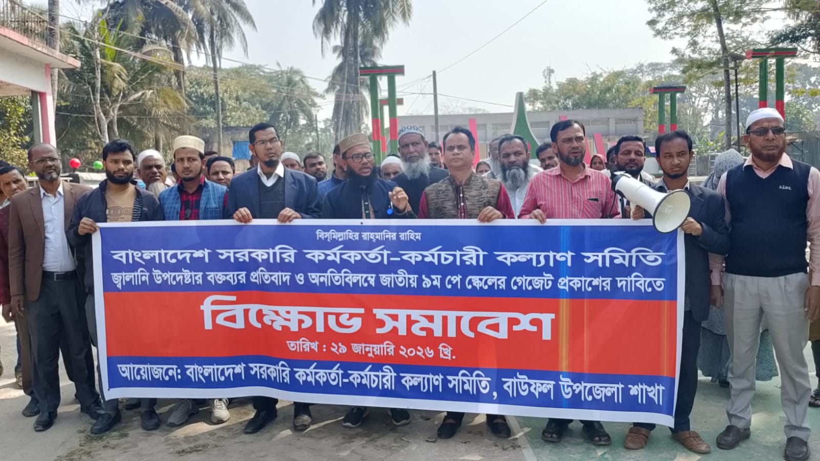 জ্বালানি উপদেষ্টার বক্তব্যের প্রতিবাদ ও ৯ম পে-স্কেলের গেজেট প্রকাশের দাবিতে বাউফলে বিক্ষোভ সমাবেশ