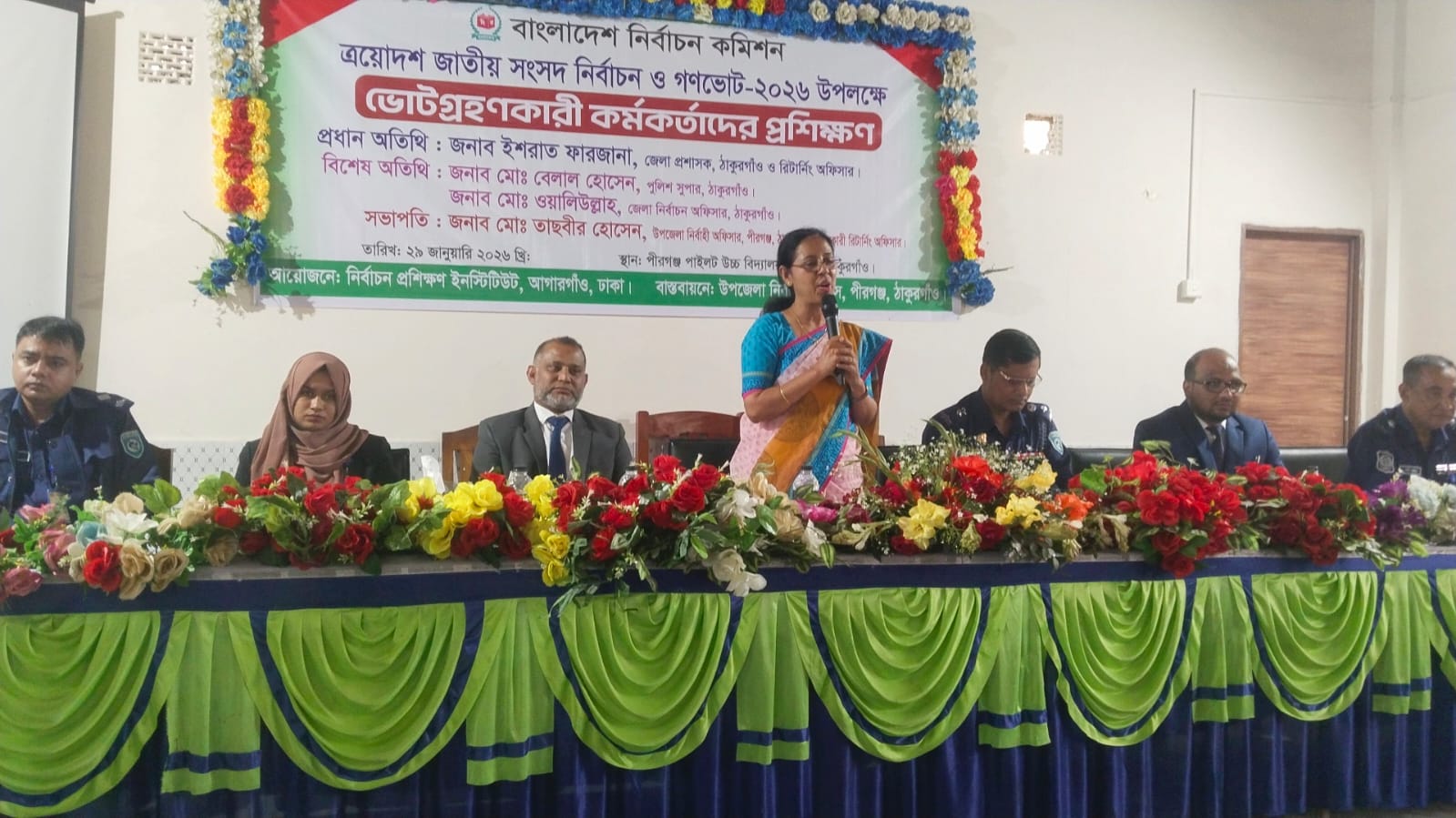 ঠাকুরগাঁওয়ের পীরগঞ্জে আসন্ন ত্রয়োদশ জাতীয় সংসদ নির্বাচন ও গণভোট–২০২৬ উপলক্ষে ভোটগ্রহণকারী কর্মকর্তাদের প্রশিক্ষণ কর্মশালা অনুষ্ঠিত হয়েছে। বৃহস্পতিবার (২৯ জানুয়ারি) পীরগঞ্জ পাইলট উচ্চ বিদ্যালয়ে এ প্রশিক্ষণ কর্মশালার আয়োজন করা হয়। নির্বাচন কমিশন ইনস্টিটিউট, আগারগাঁও, ঢাকা এর উদ্যোগে এবং উপজেলা নির্বাচন অফিস, পীরগঞ্জ, ঠাকুরগাঁও এর বাস্তবায়নে কর্মশালাটি অনুষ্ঠিত হয়।