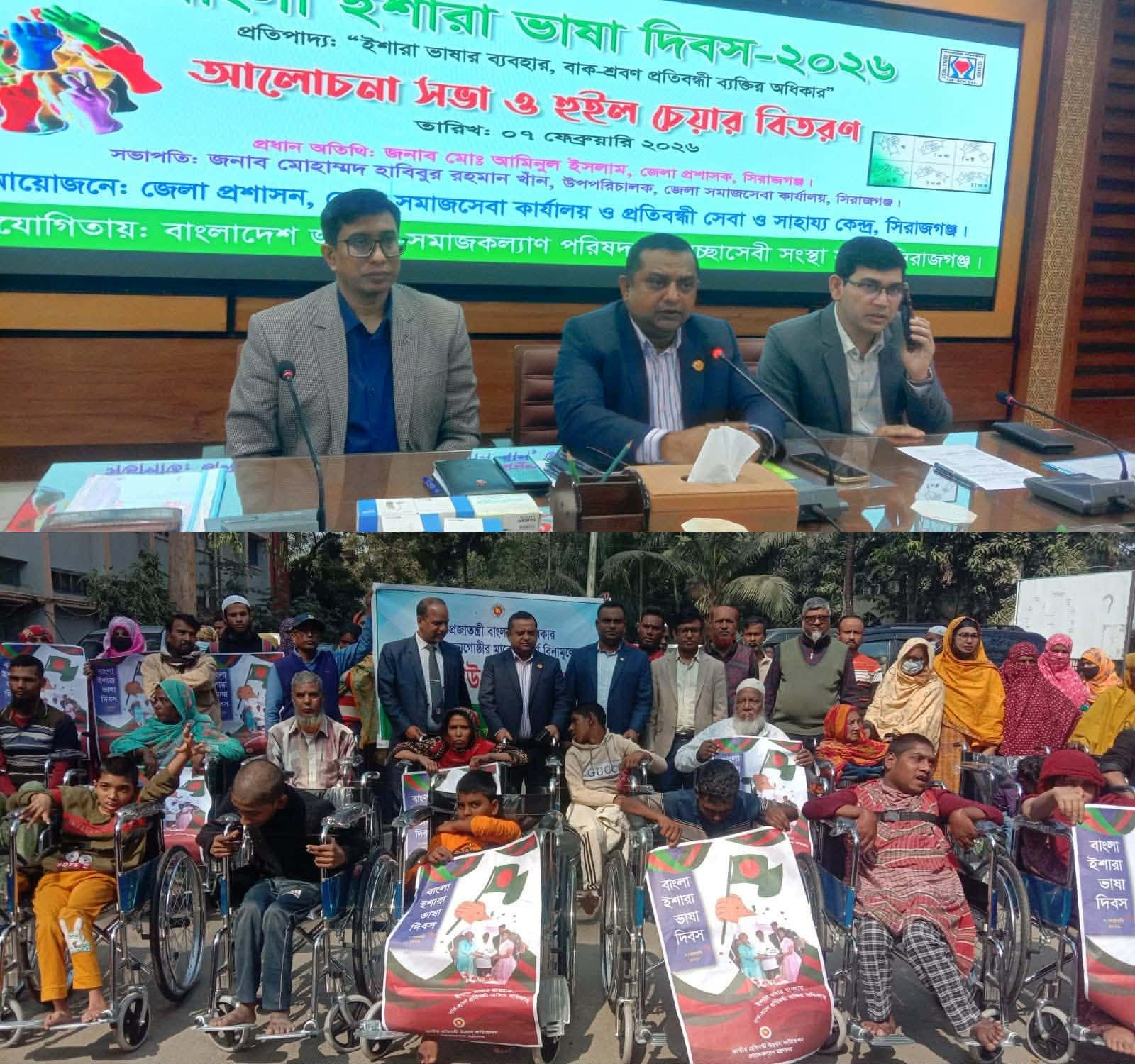 সিরাজগঞ্জে "বাংলা ইশারা ভাষা দিবস"-২০২৬ খ্রি. উপলক্ষ্যে আলোচনা সভা অনুষ্ঠিত হয় এবং প্রতিবন্ধীদের মাঝে হেয়ারিং এইড ও হুইলচেয়ার বিতরণ করা হয়। সিরাজগঞ্জ জেলা প্রশাসন, জেলা সমাজসেবা কার্যালয় ও প্রতিবন্ধী সেবা কেন্দ্র সিরাজগঞ্জের আয়োজনে এবং বাংলাদেশ জাতীয় সমাজকল্যাণ পরিষদ ও স্বেচ্ছাসেবী সংস্থা সিরাজগঞ্জের সহযোগিতায়-
