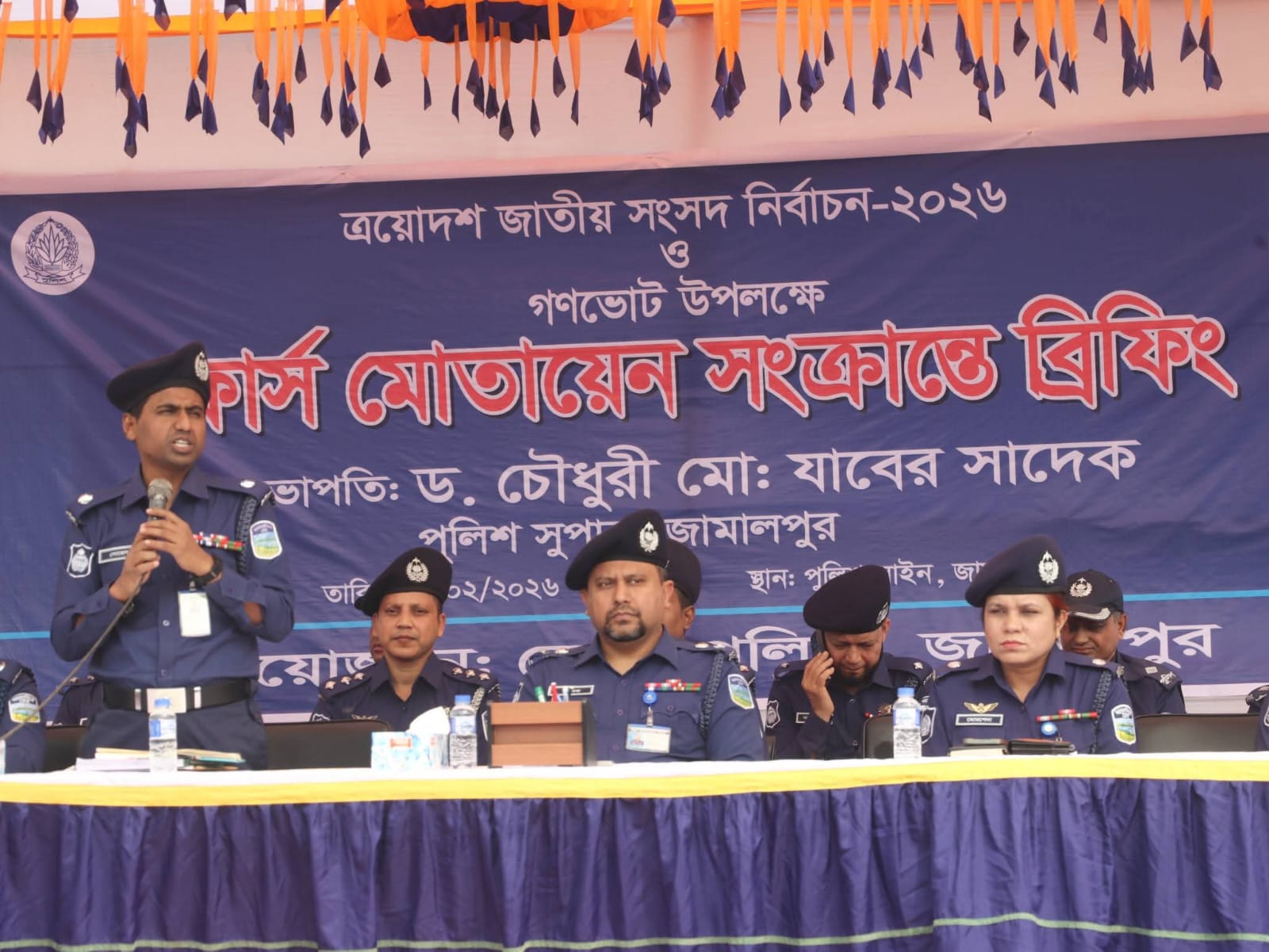 আজ মঙ্গলবার (১০ ফেব্রুয়ারি) জামালপুর পুলিশ লাইন্স মাঠে ত্রয়োদশ জাতীয় সংসদ নির্বাচন–২০২৬ ও গণভোটকে সামনে রেখে আইন-শৃঙ্খলা পরিস্থিতি সুষ্ঠু ও শান্তিপূর্ণ রাখার লক্ষ্যে ফোর্স মোতায়েন সংক্রান্ত ব্রিফিং অনুষ্ঠিত হয়েছে। অনুষ্ঠানে সভাপতিত্ব করেন জনাব ড. চৌধুরী মোঃ যাবের সাদেক, পুলিশ সুপার, জামালপুর মহোদয়।