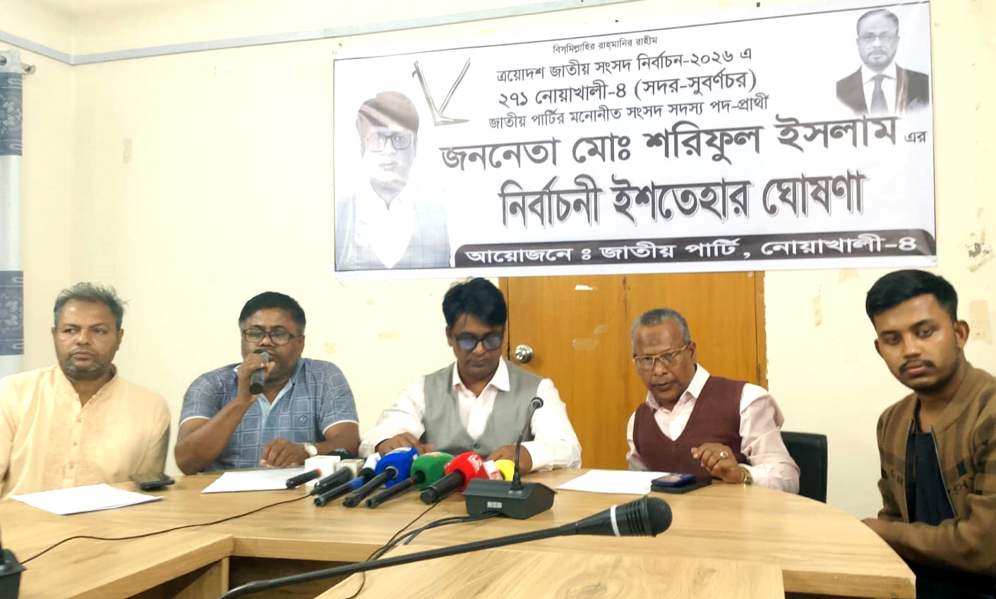 নোয়াখালী-৪ (সদর-সুবর্ণচর) আসনে জাতীয় পার্টি মনোনীত লাঙ্গল প্রতীকের সংসদসদস্য পদপ্রার্থী মোঃ শরিফুল ইসলাম সাংবাদিকদের সাথে মতবিনিময় সভায় তাঁর নির্বাচনী ইশতেহারঘোষণা করেছেন। গতকাল নোয়াখালী প্রেসক্লাবের শহীদ উদ্দিন ইসকান্দার কচি মিলনায়তনে এ ইশতেহারঘোষণা করা হয়। অনুষ্ঠানে প্রার্থী নিজেই তাঁর নির্বাচনী অঙ্গীকার ও এলাকার উন্নয়ন পরিকল্পনা তুলে ধরেন।তিনি বলেন, নির্বাচিত হলে নোয়াখালী-৪ আসনে অবকাঠামোগত উন্নয়ন, কর্মসংস্থান সৃষ্টি, বন্যা ও জলাবদ্ধতা নিরসন, শিল্পায়ন এবং নাগরিক সেবা সম্প্রসারণে অগ্রাধিকার দেওয়া হবে। পাশাপাশি নোয়াখালী বিভাগ বাস্তবায়ন, সুবর্ণচরকে পৌরসভায় উন্নীতকরণ, নোয়াখালী সিটি করপোরেশন গঠন, ইকোনমিক জোন, বিমানবন্দর ও সমুদ্র বন্দর স্থাপনের উদ্যোগ নেওয়ার অঙ্গীকার ব্যক্ত করেন। অনুষ্ঠান সঞ্চালনা করেন জাতীয় স্বেচ্ছাসেবক পার্টির কেন্দ্রীয় সদস্য মোঃ কামাল উদ্দিন। এসময় উপস্থিত ছিলেন জেলা জাতীয় পার্টির সিনিয়র যুগ্ম সাধারণ সম্পাদক মোসাদ্দেকুর রহমান, সমবিষয়ক সম্পাদক মহিন উদ্দিন পরান, জাতীয় পার্টির বিভাগীয় সাংগঠনিক সম্পাদক কামাল উদ্দিন, প্রচার সম্পাদক সিরাজুল হক সিরাজসহ জেলা জাতীয় পার্টির অঙ্গ সংগঠনের নেতৃবৃন্দ। মতবিনিময় সভায় জেলায় কর্মরত প্রিন্ট ও ইলেক্ট্রনিক মিডিয়ার সাংবাদিকরা
