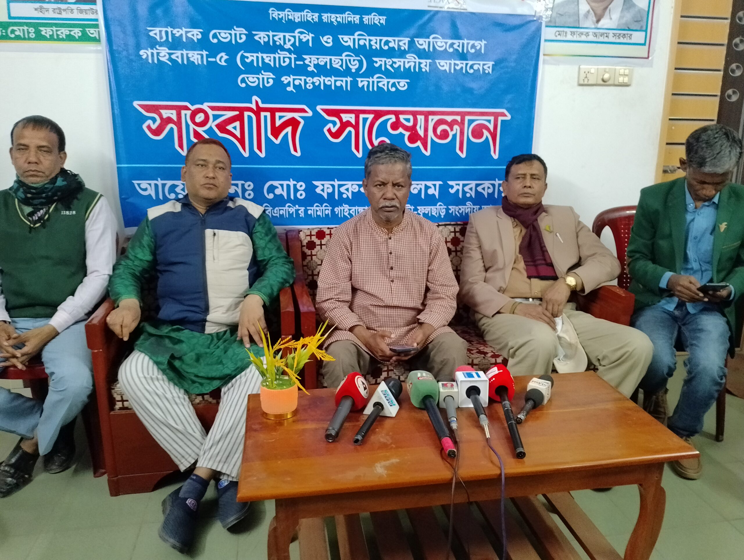 গাইবান্ধা-৫ (সাঘাটা-ফুলছড়ি) আসনের সংসদীয় নির্বাচনে ব্যাপক কারচুপি ও অনিয়মের অভিযোগ তুলেছেন প্রার্থী আলহাজ্ব মো. ফারুক আলম সরকার। নির্বাচনের ফলাফল প্রত্যাখ্যান করে ভোট পুনঃগণনা এবং এই প্রক্রিয়া শেষ না হওয়া পর্যন্ত গেজেট প্রকাশ স্থগিত রাখার জন্য রিটার্নিং অফিসারের কাছে লিখিত আবেদন জানিয়েছেন তিনি।
