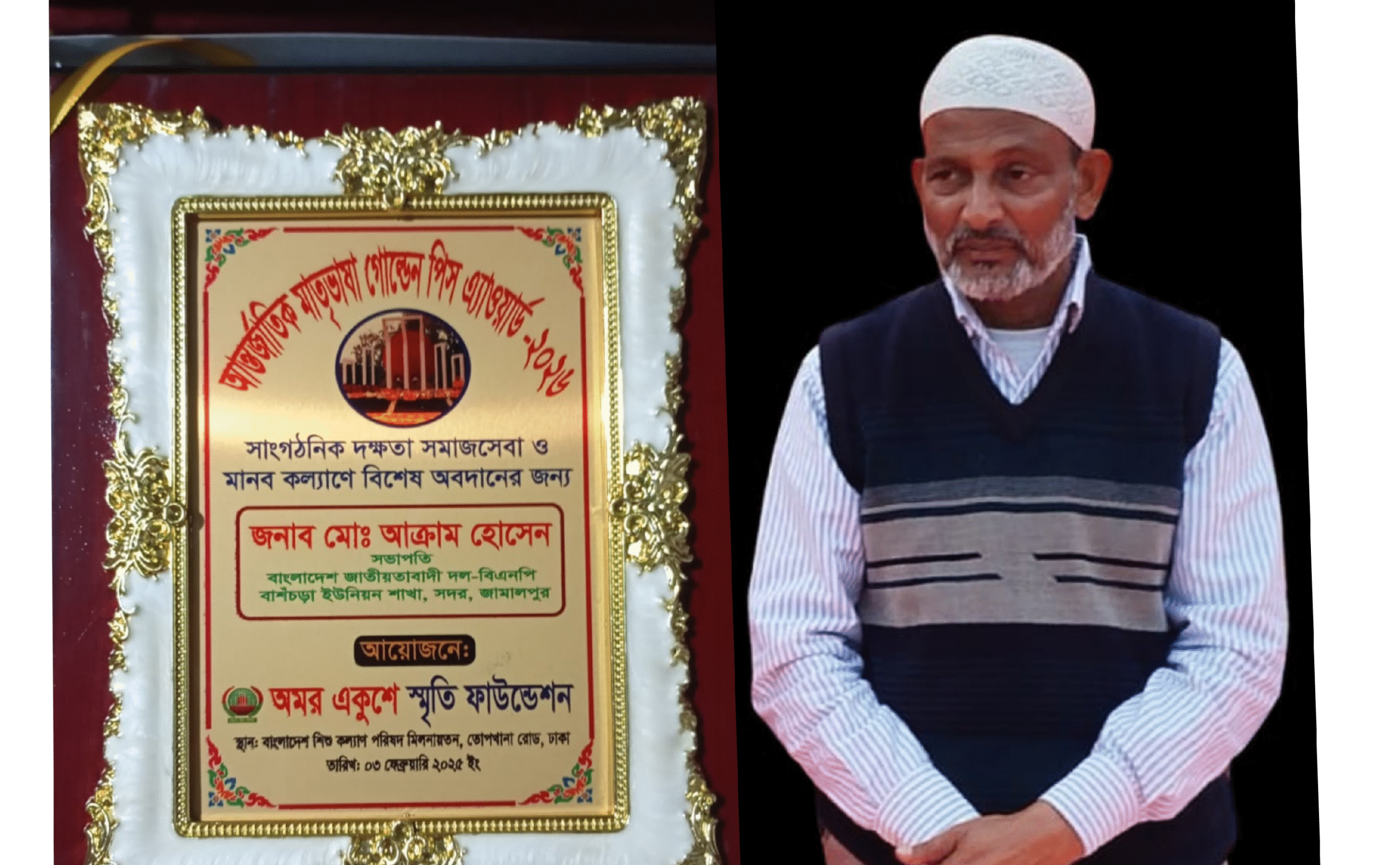 জামালপুর সদর উপজেলার ৮ নং বাঁশচড়া ইউনিয়ন বিএনপির বর্তমান সভাপতি মোঃ আক্রাম হোসেন তাঁর সাংগঠনিক দক্ষতা, সমাজসেবা ও মানবকল্যাণমূলক কর্মকাণ্ডের স্বীকৃতিস্বরূপ “মহান আন্তর্জাতিক মাতৃভাষা গোল্ডেন পিস অ্যাওয়ার্ড–২০২৬” এ ভূষিত হয়েছেন।