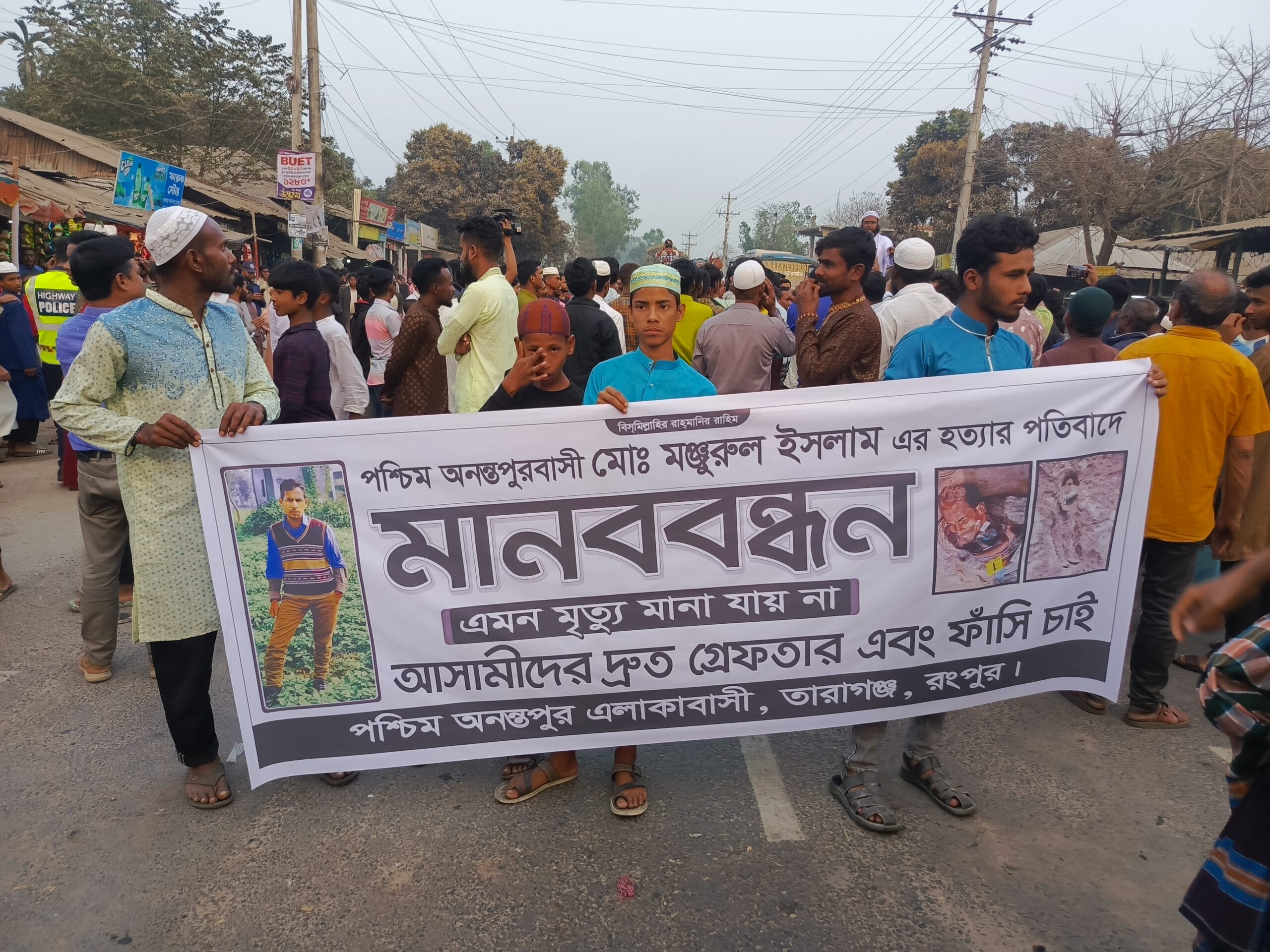 রংপুরের তারাগঞ্জ উপজেলায় পল্লী বিদ্যুৎ সমিতির ইলেকট্রিশিয়ান মনজুরুল ইসলামের (৪৫) হত্যাকারীদের দ্রুত গ্রেপ্তার করে ফাঁসির দাবিতে মহাসড়ক অবরোধ করেছে এলাকাবাসী। গত শুক্রবার (২৭ ফেব্রুয়ারি) বিকাল ৫টার ৩০ মিনিটে উপজেলার নতুন চৌপথী বাসষ্ট্যাণ্ডে মহাসড়ক অবরোধ করা হয়।