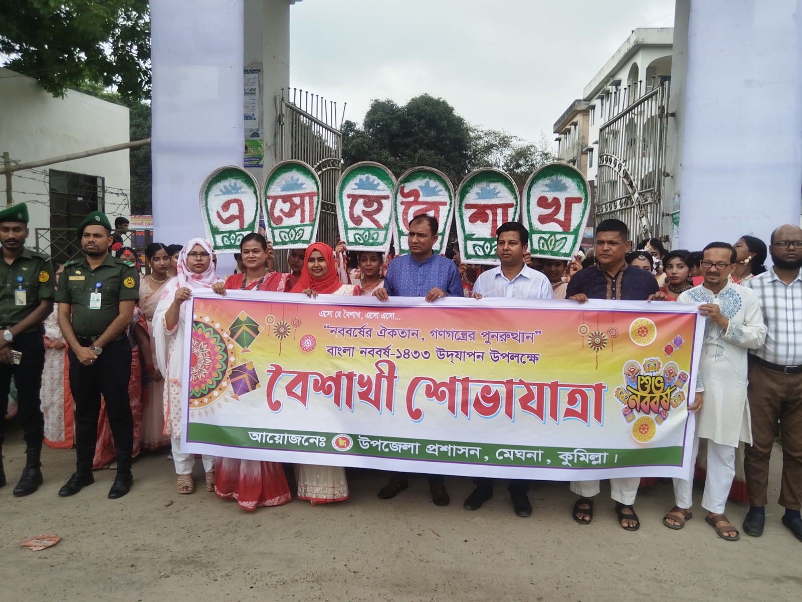 কুমিল্লার মেঘনা উপজেলায় বাংলা নববর্ষ-১৪৩৩ উদযাপন অনুষ্ঠিত হয়েছে। মঙ্গলবার (১৪ এপ্রিল) সকাল ৯টায় উপজেলা প্রশাসনের আয়োজনে উপজেলা পরিষদ চত্বরে বাংলা নববর্ষ-১৪৩৩ উদযাপন উপলক্ষে জাতীয় সংগীত পরিবেশন এবং ‘এসো হে বৈশাখ’ গান পরিবেশনের মাধ্যমে নববর্ষ-১৪৩৩ এর উদ্বোধন করা হয়।