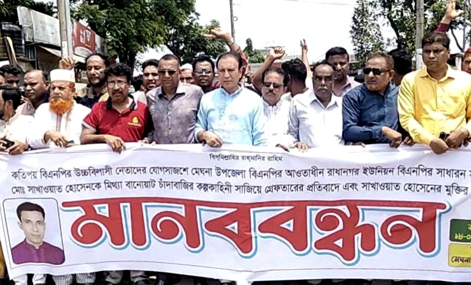 কুমিল্লা মেঘনায় অবৈধ ও ষড়যন্ত্রমূলক প্রতিহিংসার শিকার হয়ে রাধানগর ইউনিয়নের লক্ষণখোলা গ্রামের ৫ নং ওয়ার্ডের মেম্বার (প্যানেল চেয়ারম্যান) ও ইউনিয়ন বিএনপির সাধারণ সম্পাদক সাখাওয়াত হোসেনকে মিথ্যা অভিযোগে গ্রেফতারের প্রতিবাদে বিক্ষোভ মিছিল ও মানববন্ধন অনুষ্ঠিত হয়েছে।