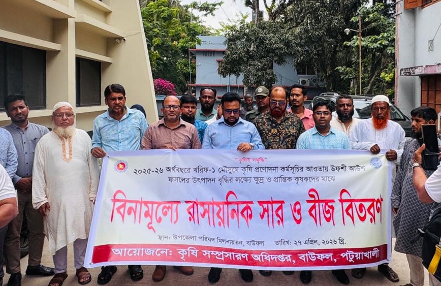 পটুয়াখালীর বাউফল উপজেলায় ক্ষুদ্র ও প্রান্তিক কৃষকদের মাঝে বিনামূল্যে রাসায়নিক সার ও বীজ বিতরণ করা হয়েছে। ২০২৫-২৬ অর্থবছরের খরিপ মৌসুমে কৃষি প্রণোদনা কর্মসূচির আওতায় উপজেলা কৃষি সম্প্রসারণ অধিদপ্তরের উদ্যোগে এ কার্যক্রম অনুষ্ঠিত হয়।