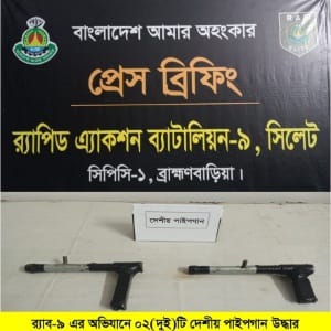 ব্রাহ্মণবাড়িয়া সদর উপজেলায় বিশেষ অভিযান চালিয়ে একটি স্কুলের টয়লেটের ছাদ থেকে পরিত্যক্ত অবস্থায় দুটি দেশীয় পাইপগান উদ্ধার করেছে র্যাব-৯। বৃহস্পতিবার (২৬ ডিসেম্বর) রাত আনুমানিক ১০টার দিকে উপজেলার রামরাইল ইউনিয়নের সেন্দা