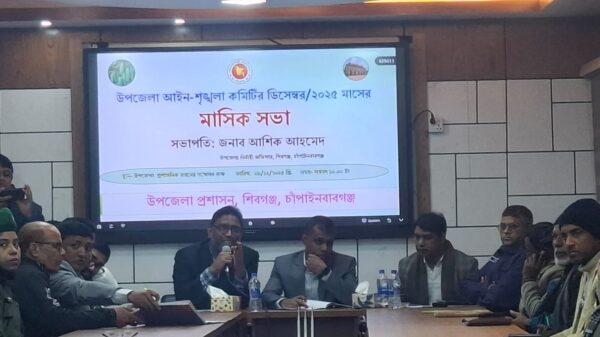 চাঁপাইনবাবগঞ্জের শিবগঞ্জ উপজেলায় উপজেলা আইন-শৃঙ্খলা কমিটির ডিসেম্বর/২০২৫ মাসের মাসিক সভা অনুষ্ঠিত হয়েছে। রোববার (২৯ ডিসেম্বর) সকাল ১০টায় উপজেলা প্রশাসনিক ভবনের সম্মেলন কক্ষে এ সভা অনুষ্ঠিত হয়। সভায় সভাপতিত্ব করেন উপজেলা